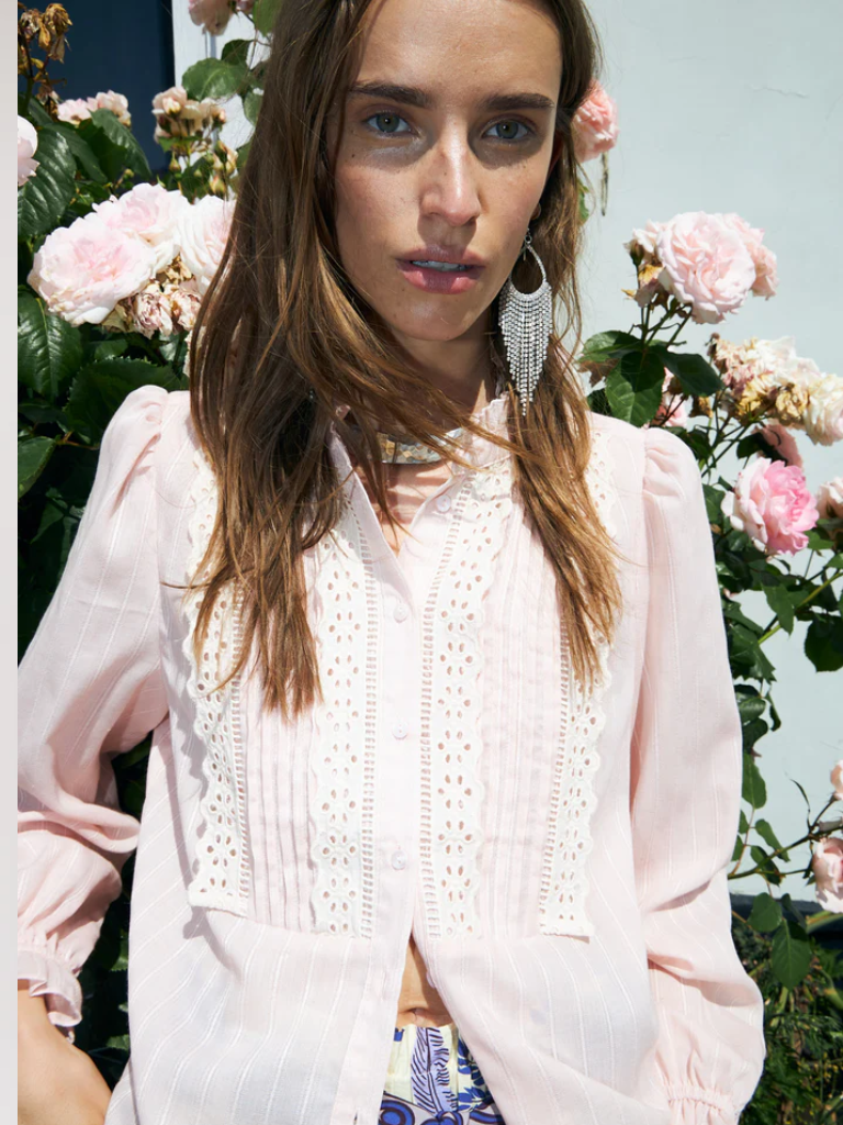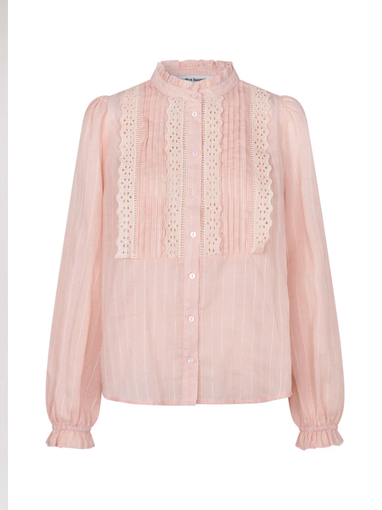 ArielLL is a feminine shirt made in a light and soft quality with subtle striped details and decorative lace on the front. It features a delicate ruffled neckline, a soft puff at the shoulders, and long sleeves with ruffle details at the cuffs. A beautiful shirt that elevates jeans, skirts, and classic trousers alike.