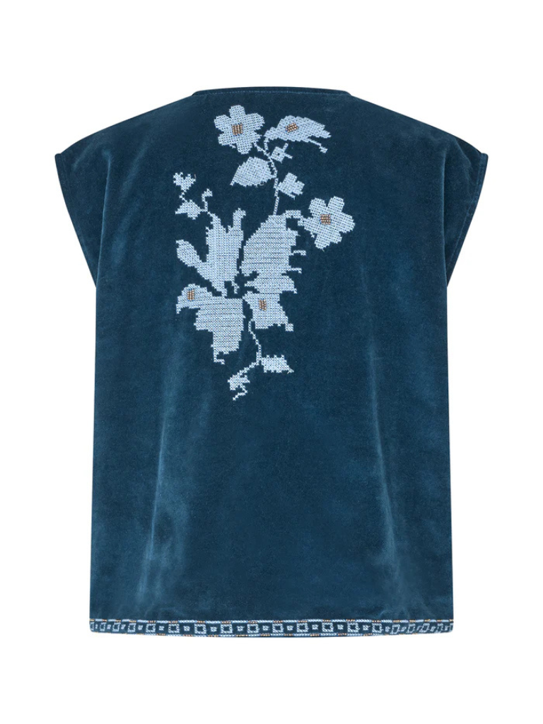 The BinLL vest is a soft velour vest with beautifully artistic embroidery that brings a feminine and handcrafted expression to your look. The silhouette is relaxed with rounded edges that elegantly highlight the embroidery’s delicate details.
