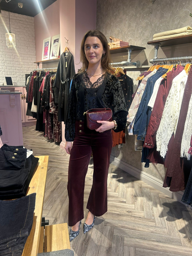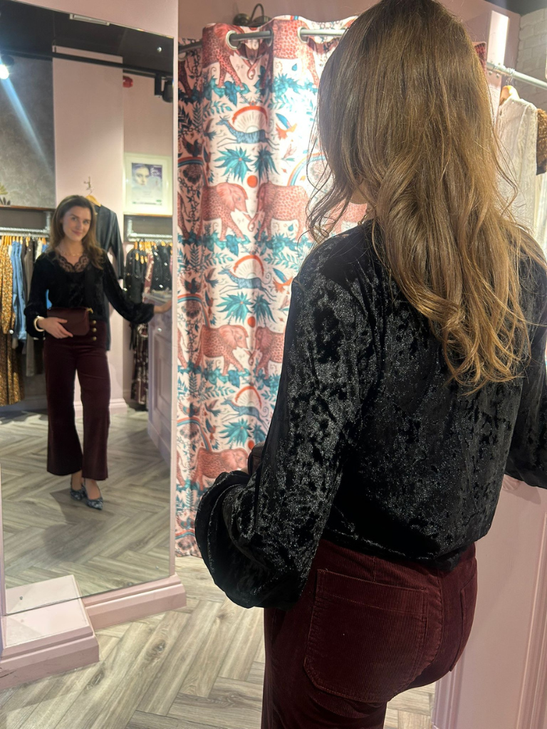 Sleeves: Long and puffy, cinched at the wrists with a discreet elastic, adding a refined vintage touch. Detail: Crushed velvet effect fabric mixed with transparent lace, vertical guipure bands on the front, and a scalloped floral lace hem. This sophisticated top combines retro charm and modernity. It pairs well with high-waisted fluid pants for an elegant silhouette or with raw jeans for a contrasting and contemporary look.