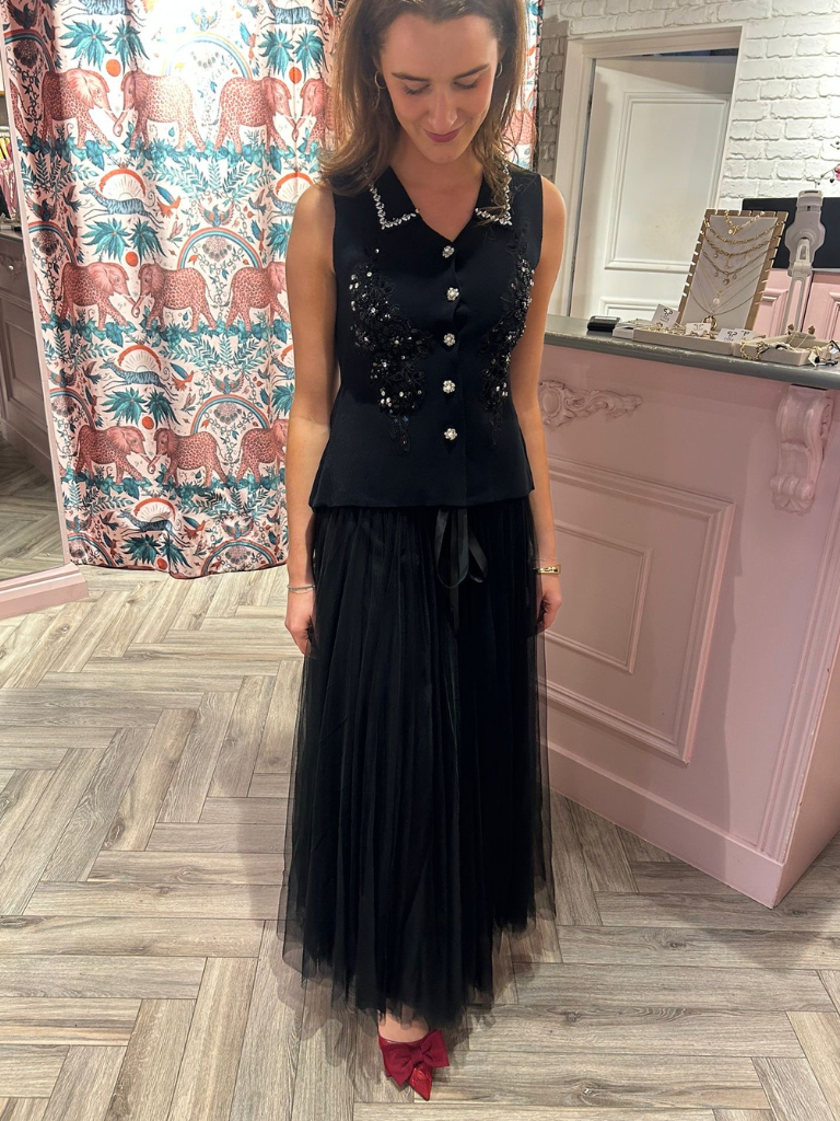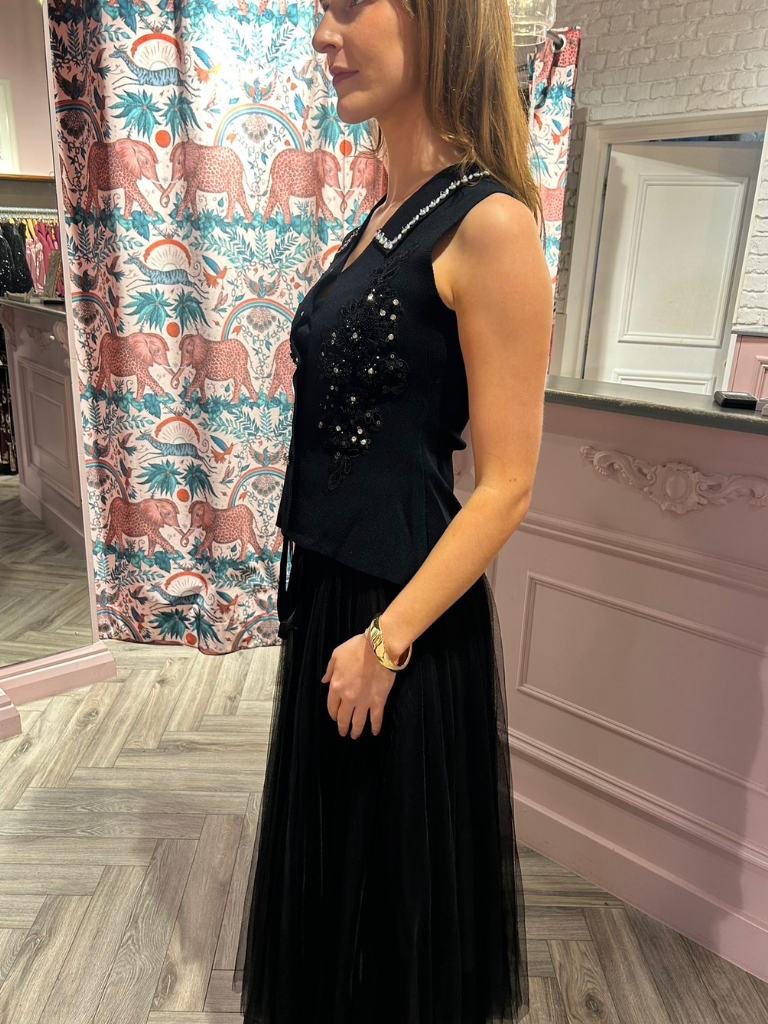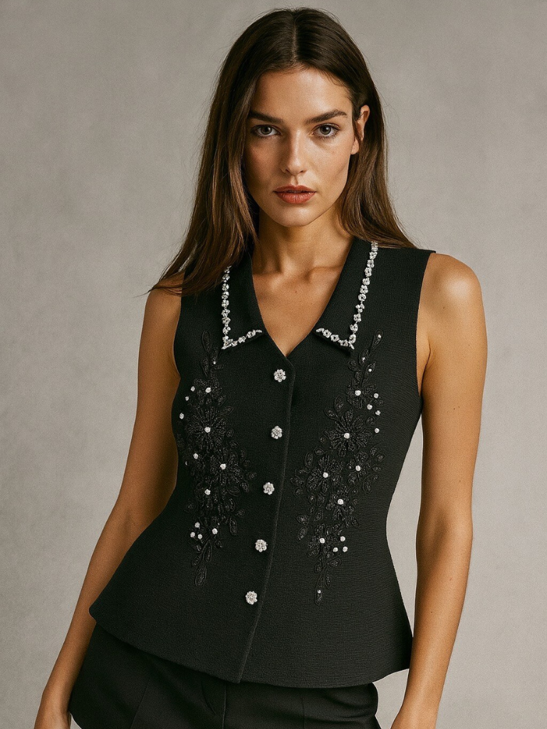A timeless piece that exudes modern sophistication, this black knit vest features exquisite tonal floral embroidery and pearl-embellished buttons for an elevated, feminine touch. Designed with a tailored silhouette and structured collar, it offers a flattering fit that transitions effortlessly from day to evening.