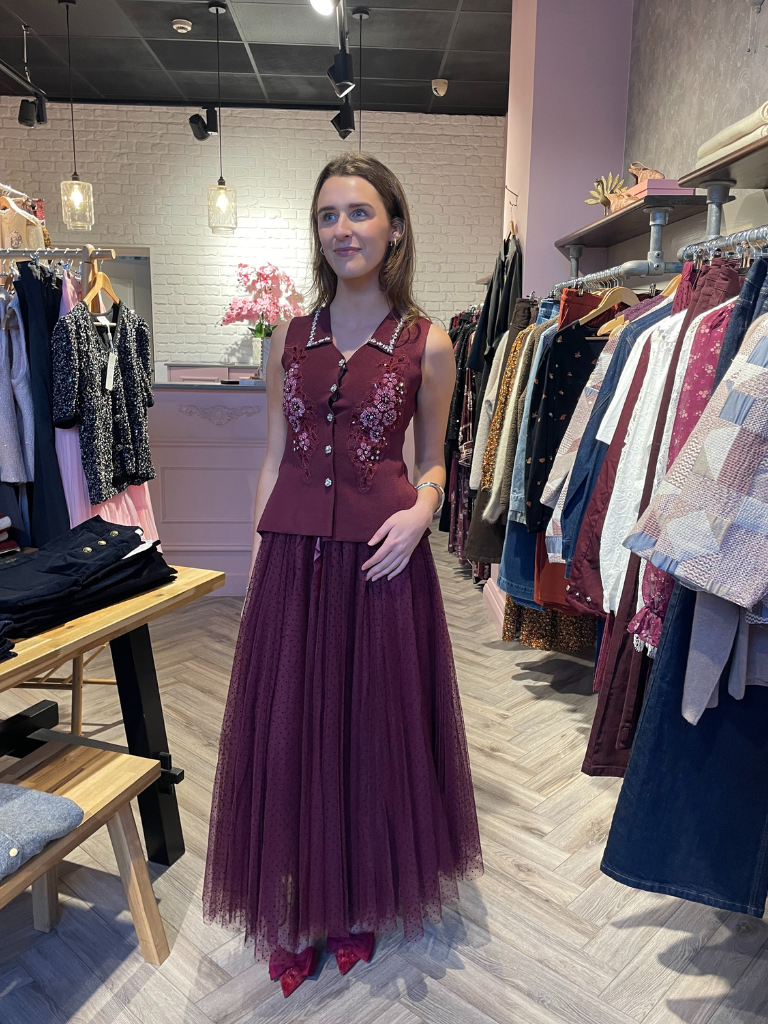 Elevate your style with this elegant burgundy knit vest, featuring exquisite floral embroidery and pearl-embellished buttons for a touch of timeless sophistication. The tailored, sleeveless silhouette and structured collar add a polished finish, while the intricate detailing enhances its luxurious appeal. Note: The top is small fitting.