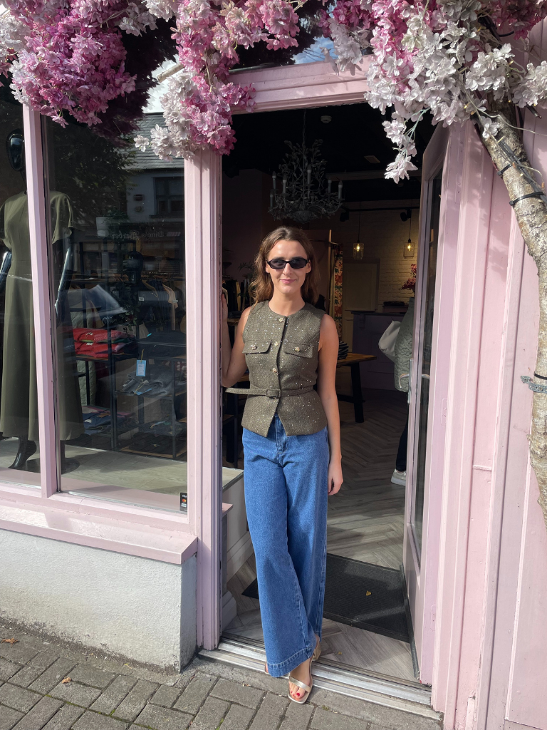This Khaki Waistcoat features a fashionable belt that cinches your waist for a perfect fit, accented with subtle sparkles that add a touch of elegant flair. This stylish waistcoat instantly brightens your outfit, making it ideal for creating polished and graceful looks. It pairs perfectly with our Tulle Skirts!