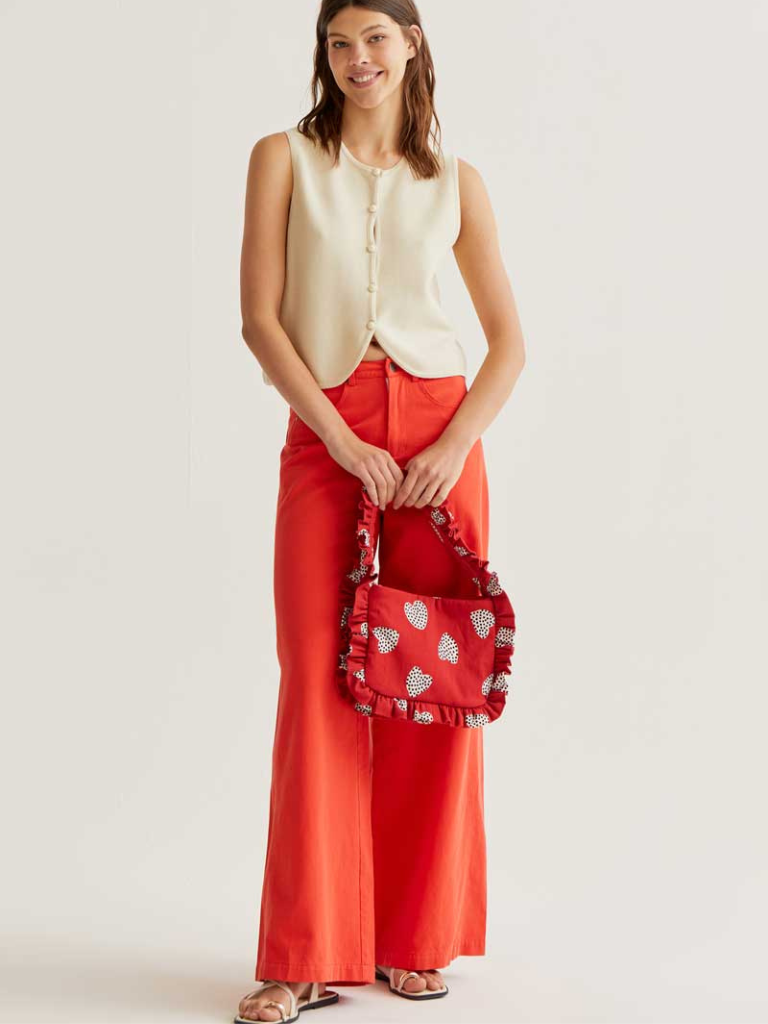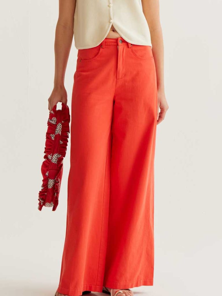 Red trousers made from 100% cotton. Fixed mid-rise waistband. Front zip and button fastening. Wide leg. Side and back pockets. The model is 177 cm tall and wears size S.