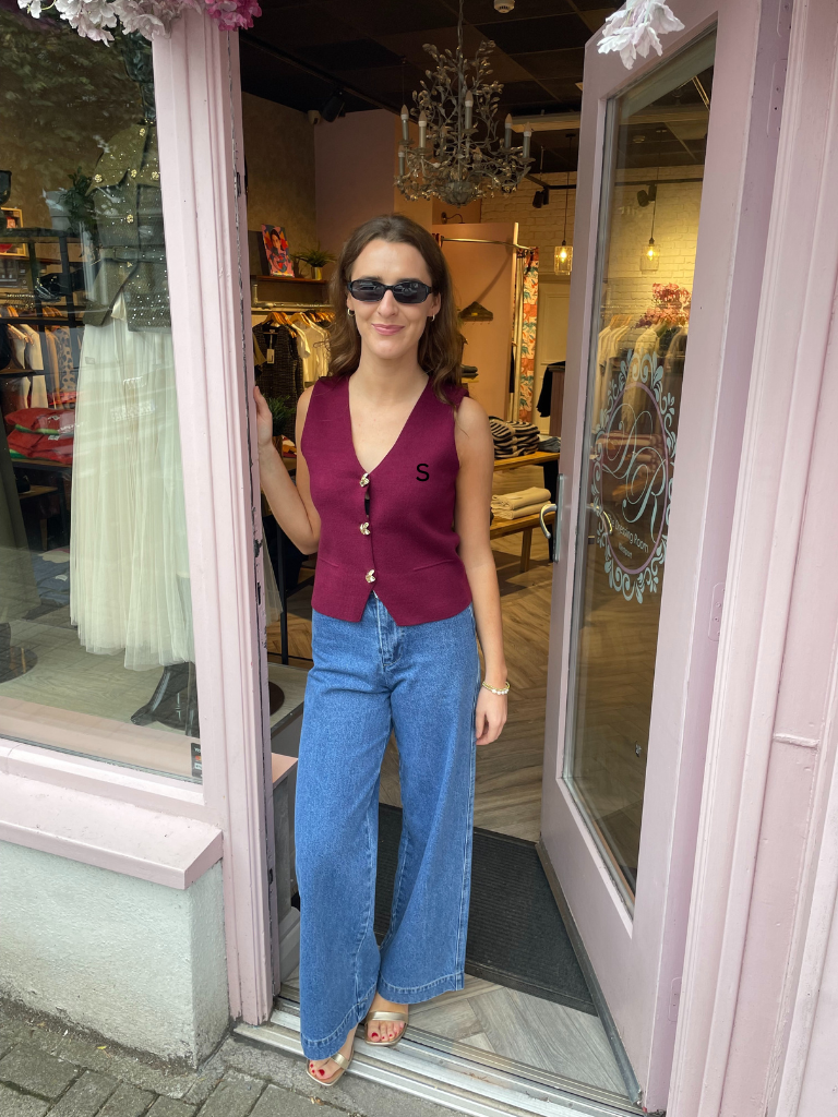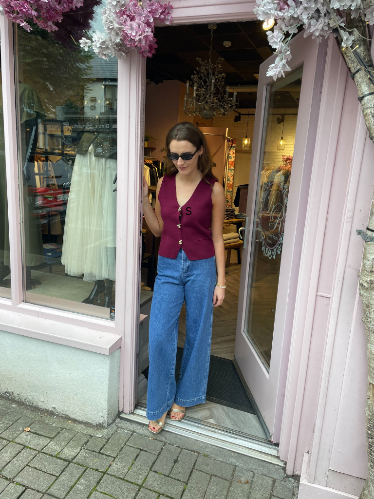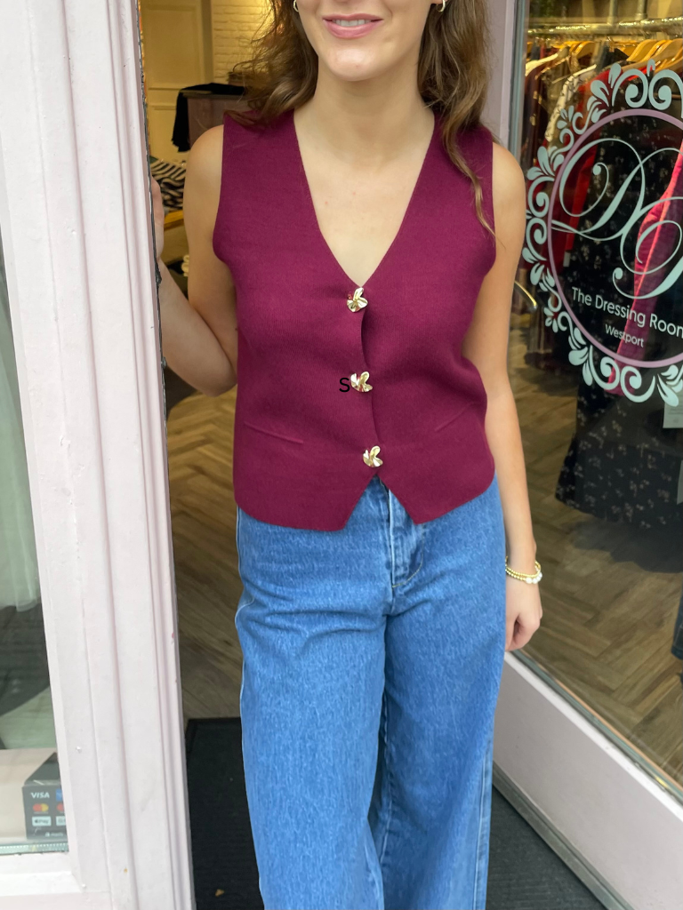 Elevate your look with the Mimi Waistcoat, showcasing a rich wine shade highlighted by striking gold buttons.