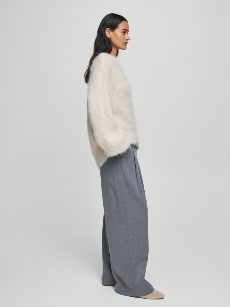 This pullover has a loose fit, with a slightly longer shape on the back. The sleeves are long and has a ribbed egde. The alpaca wool is a long haired quality.