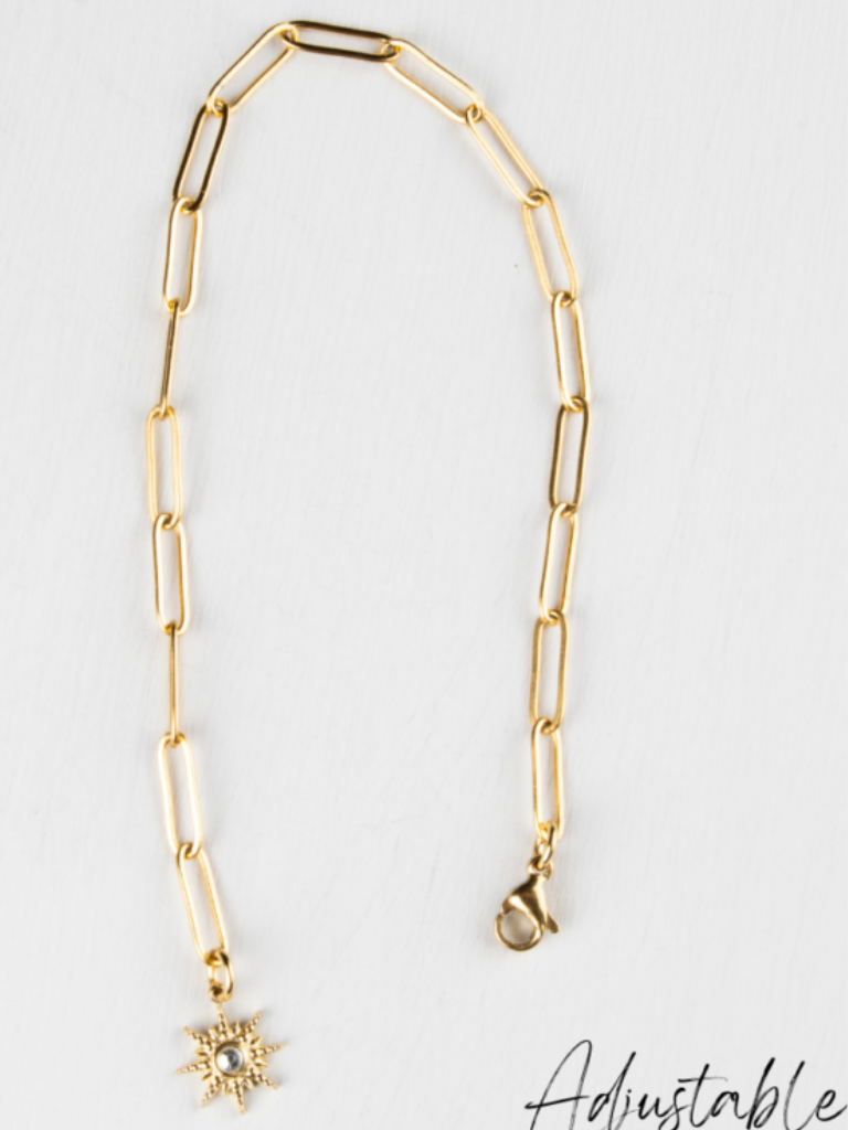 Our best selling style of bracelet is now waterproof. The bracelet is adjustable with a maximum circumference of 19.5cm. Simply use the clasp to hook onto whichever link fits best. Made from stainless steel and 18k gold plated making it waterproof.