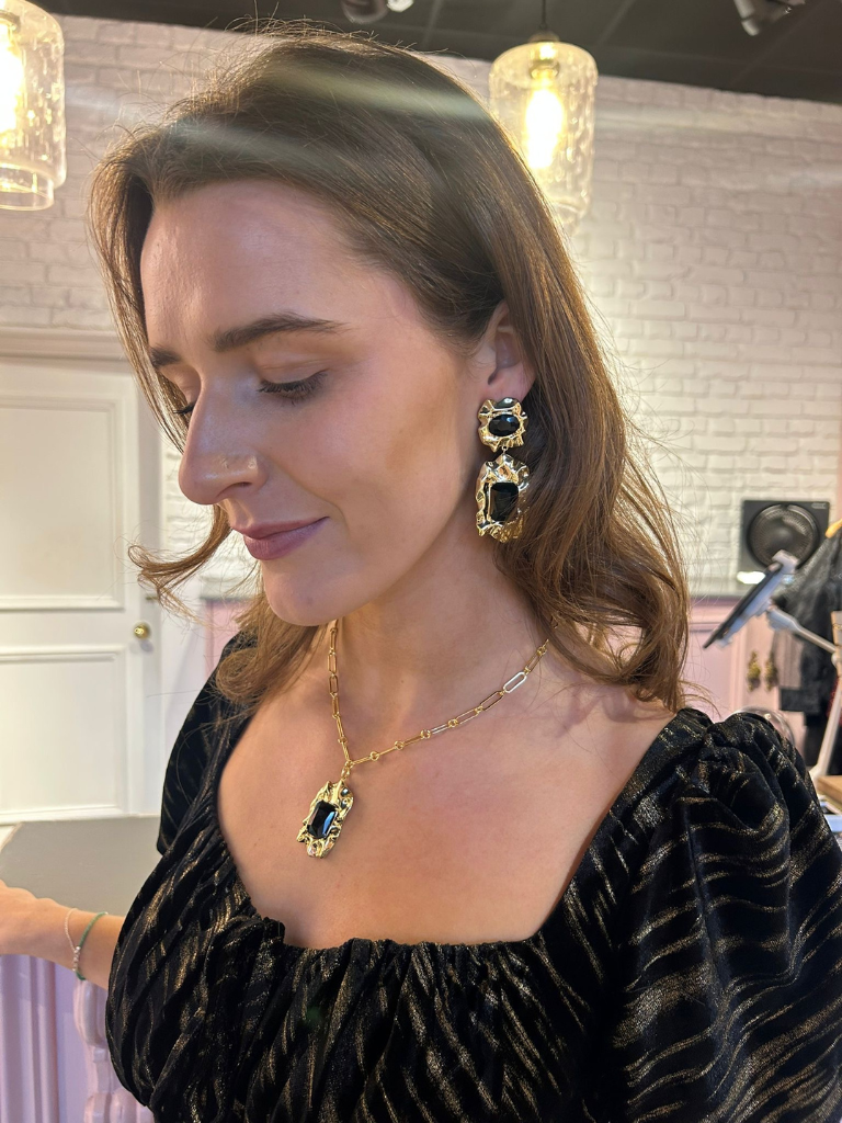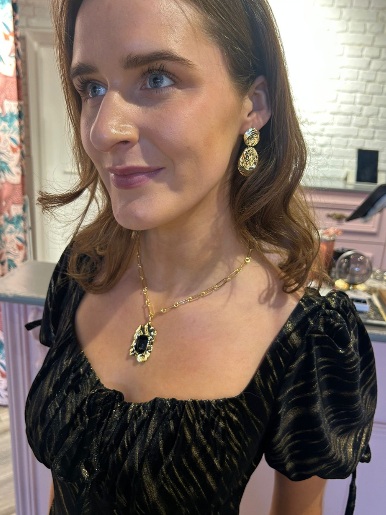 Short paperlink necklace with statement black glass stone pendant charm. Necklace measures at 41cm with 5cm extender chain. Made from brass and 14k gold plated.