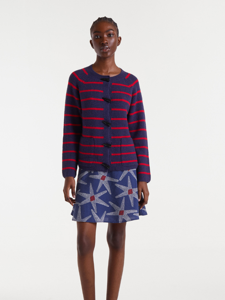 Navy and red striped cardigan with a classic round neckline and unique toggle closures. Made from a soft knit fabric, it offers a cozy fit and a bold, modern twist on a timeless design.