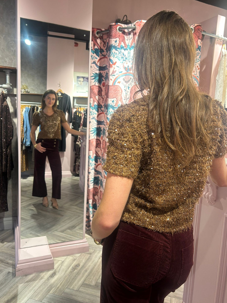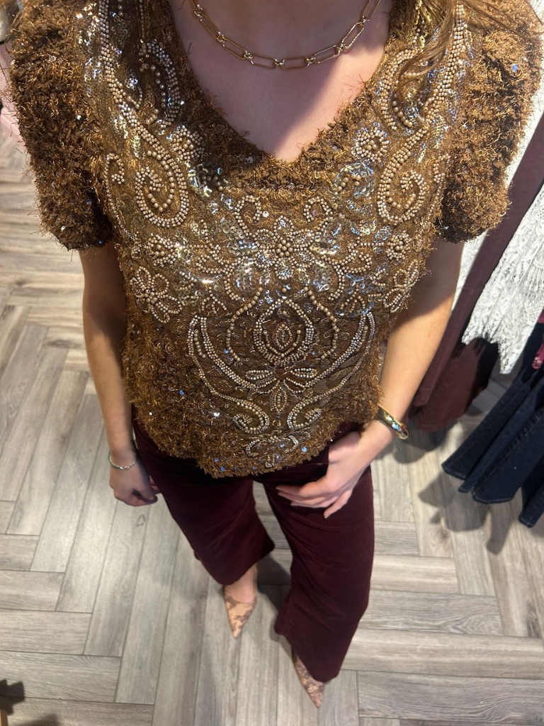 Add a touch of sparkle to your look with this elegant short-sleeve blouse. Crafted from a soft, fluffy fabric, it features intricate sequin and bead embroidery that catches the light beautifully. The flattering V-neckline and relaxed fit make it perfect for both daytime glamour and evening occasions.