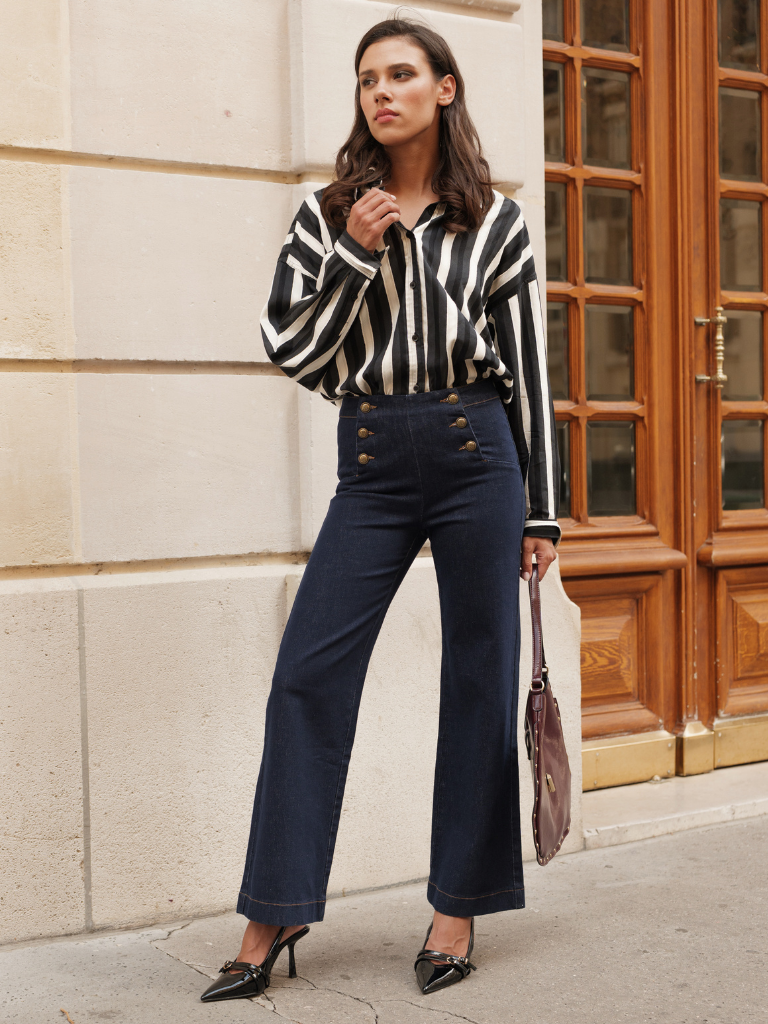 The Victorine jeans , a wide one created with precise details, a flared effect from the buttock to the ankle.